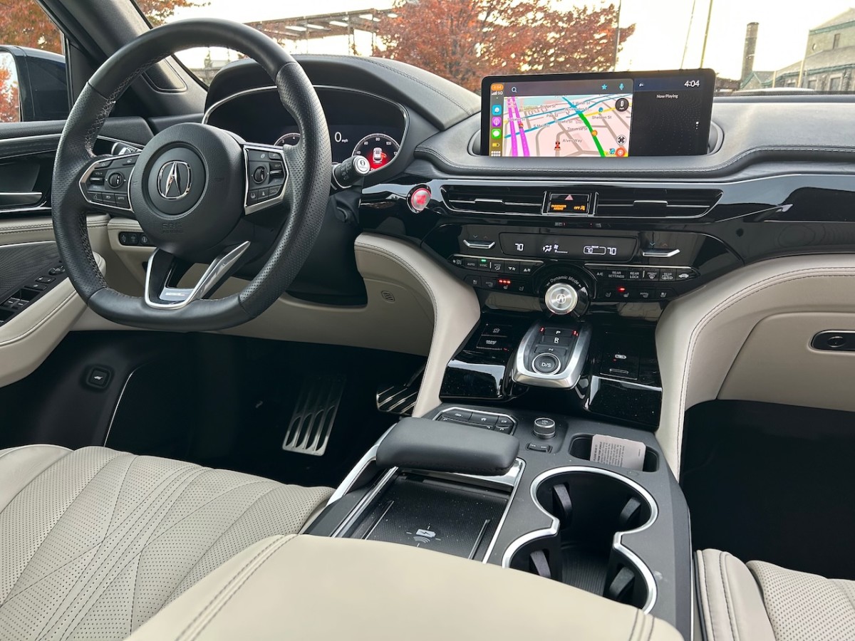 And now we come to the Acura MDX’s Achilles Heel. Although it’s full of nice features, the infotainment system’s interface is painfully clumsy. At first, the 12.3-inch display atop the dash seems like it’s a touchscreen, but then you mush your index finger onto an icon and nothing happens. To control this screen, there is a touchpad down below the shifter. You drag your finger and tap the pad to select menu items, and it is painfully unintuitive.