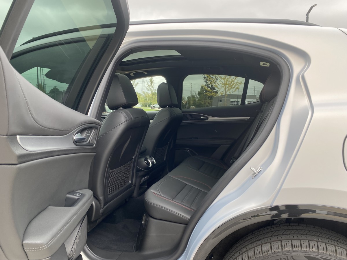 Where handling is maximized, interior space is limited. The back seats are firm and tight for average-size feet, with little legroom. The door openings are narrow at the bottom—that's the rear suspension intruding into the car—and should come with a low height warning at the top. You'll look great getting out of a Stelvio, so long as you don't sit back here for too long.