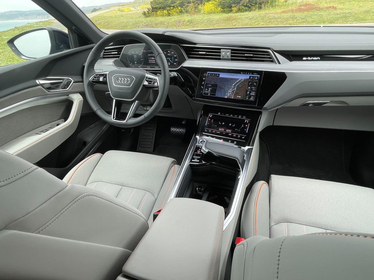 The Launch Edition model we tested was finished in Daytona Grey Pearl exterior paint with a contrasting Flint Grey interior and orange stitching. Riding on black-painted, 21-inch “aero structure design wheels,” the Q8 e-tron is a handsome SUV inside and out—though also one that never turned a single head during our day behind the wheel. Remember what we said about automotive extroverts possibly being underwhelmed?