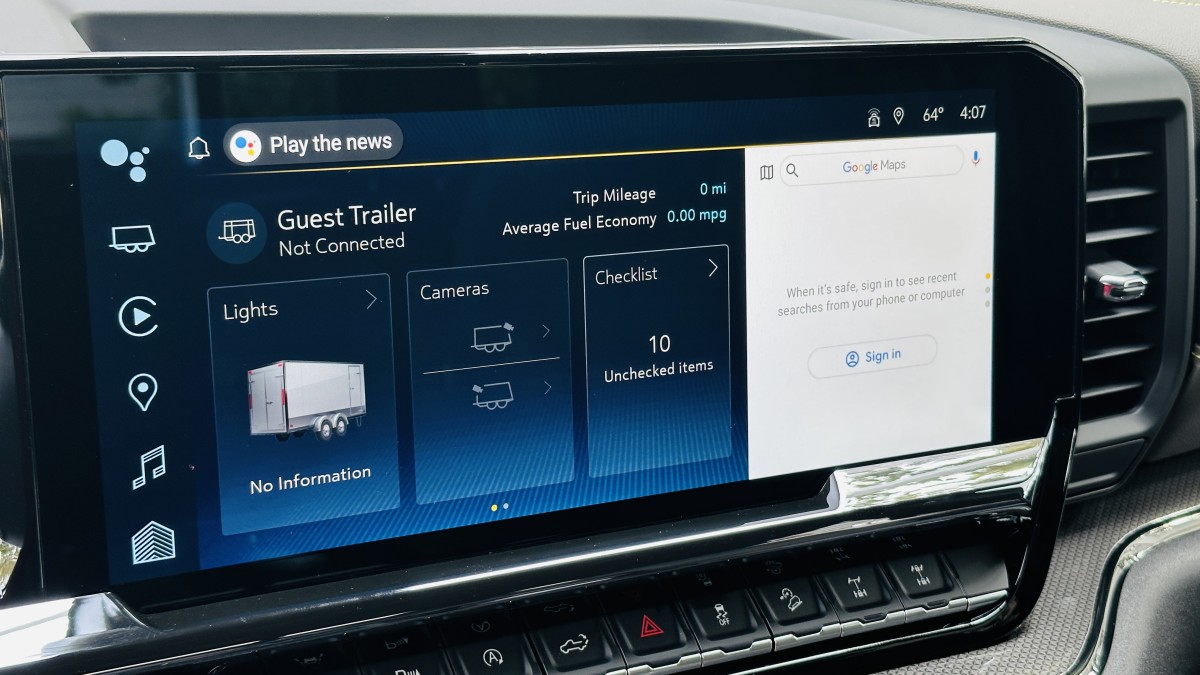 Chevy knocks it out of the park when it comes to trailering technology. Although it doesn’t have a back-up assist like the Ford F-150, you can get cameras with up to 14 different views. Yep, four different views of your hitch, four views when parking, and six different driving views including blind-spot monitoring that covers the length of the trailer. There is also an automatic trailer light test and a towing checklist to make sure drivers haven’t forgotten anything important like attaching the chains or setting the trailer brakes.