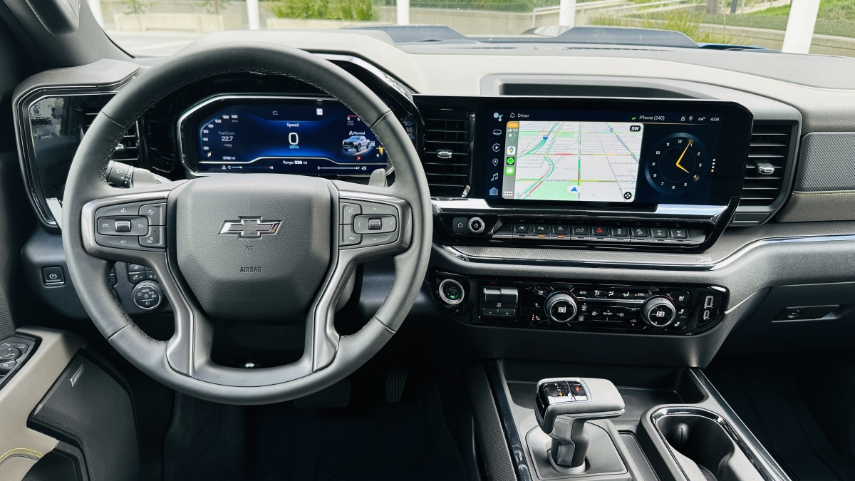 Chevrolet offers the 2024 Silverado 1500 with four engine choices. The standard engine is a turbocharged four-cylinder engine with 310 horsepower mated to an eight-speed automatic transmission. There are two V8s: a 5.3-litre and a 6.2-litre, the larger of which makes 420 ponies. The two V8s both pair with a 10-speed automatic. However, our tester came with the new 3.0-litre six-cylinder Duramax turbodiesel pushing out 305 horsepower and 495 pound-feet of torque, the most twist of the bunch.