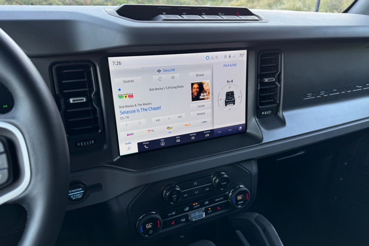 We had some trouble with the Bronco’s Sync 4 technology. For several days, it kept dropping the Apple CarPlay connection each time we got in and started the engine, rather than automatically reconnecting and relaunching. Also, the voice recognition system delivered a hit-and-miss performance, and we had some trouble streaming music from Pandora and Apple Music. Frustratingly, none of these issues proved consistent or predictable.