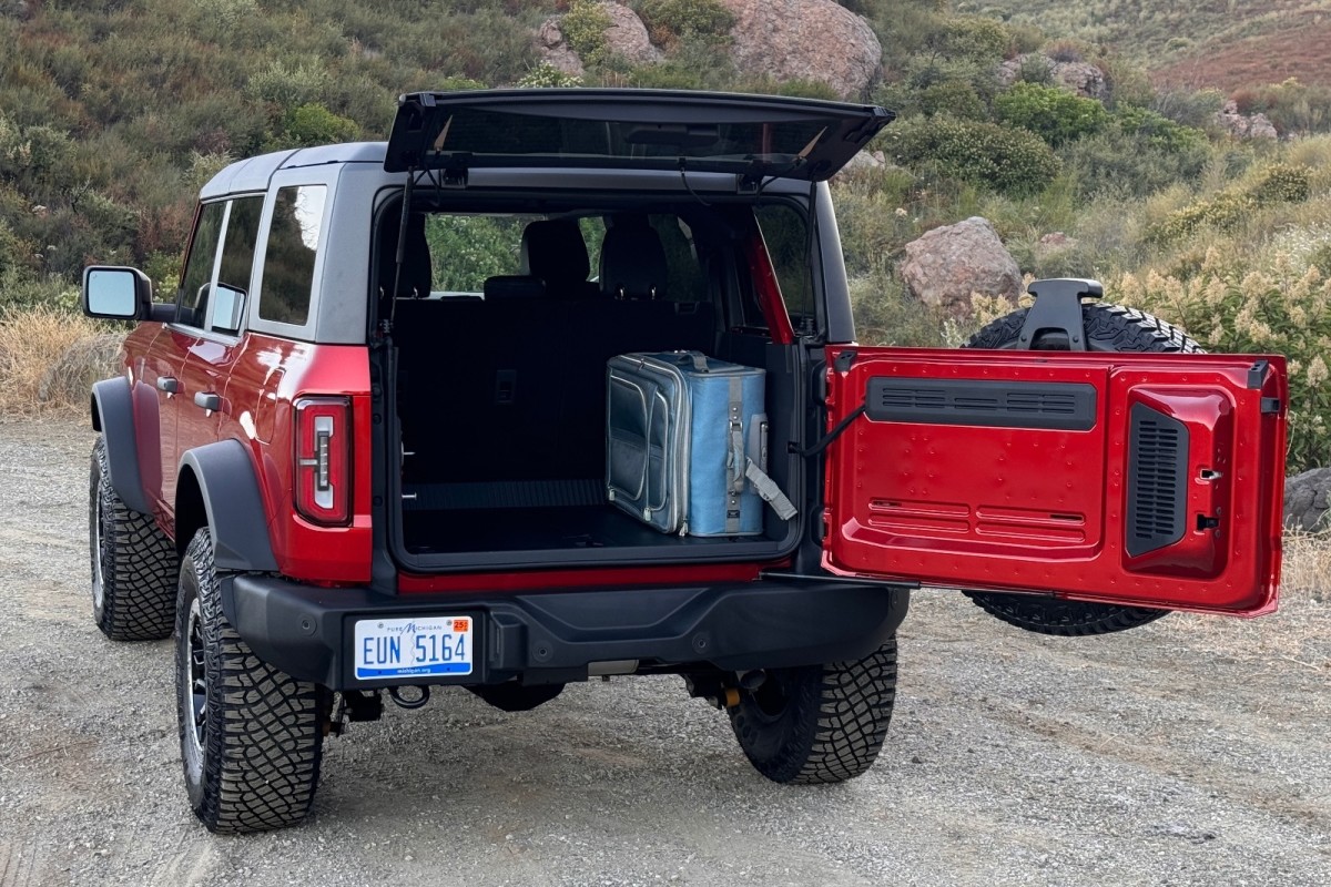 Swing the Bronco’s tailgate open to the right, lift the two-door hardtop’s back window, and you’ll find 634 litres of cargo space. Fold the back seats down, and this version of the Bronco offers 1,509 litres of cargo volume. With the standard soft top, the larger Bronco four-door is more accommodating at 1,084 and 2,350 litres with the rear seat backs up and down, respectively. Add the optional hardtop and those cargo volumes drop to 1,008 and 2,197 litres.