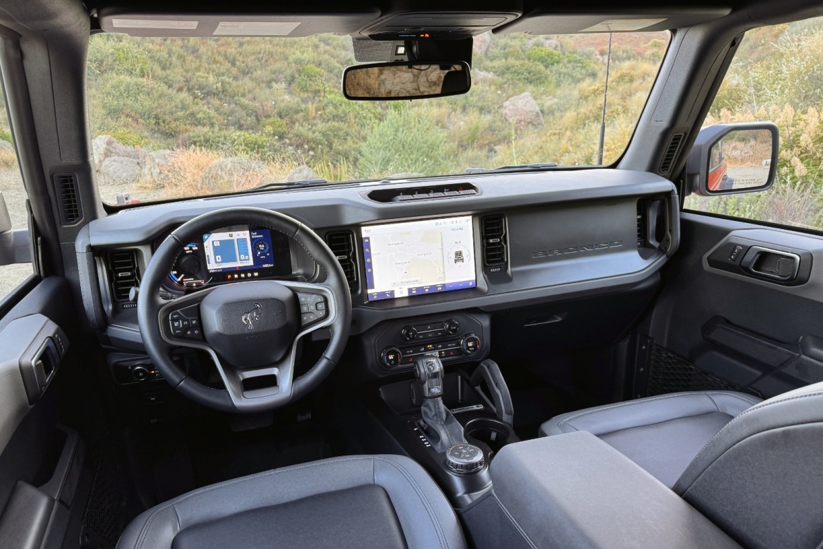 Our lifted Big Bend Sasquatch did not have the Bronco’s optional running boards, tube steps, or hoop steps, so getting in and out took a little more effort, especially for shorter people. But that’s true of the Bronco’s rivals, too.