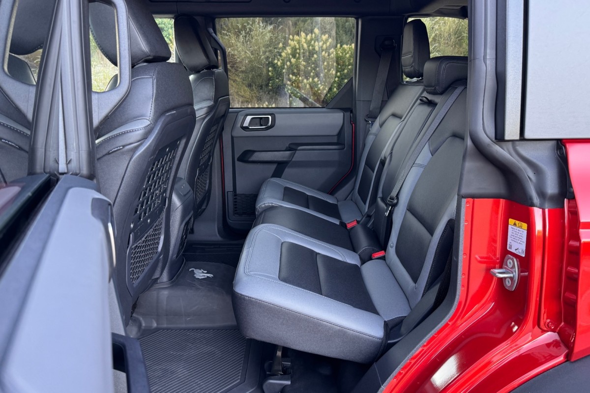 Naturally, the Bronco four-door is even roomier inside, and it feels appreciably larger than a Wrangler. Also, there isn’t a rollbar located directly in front of the rear-seat passengers like there is the Jeep, so they won’t bounce and hit their heads on anything when you’re on a trail. As previously mentioned, the Bronco’s marine-grade vinyl upholstery doesn’t breathe well, so it traps moisture. If you’re wet from rain or sweat when you get in, chances are you’ll still be damp when you exit. Cloth seats are available in the Heritage Edition, providing a great reason to choose that model. Ford should offer a stain- and water-resistant fabric upholstery option across most of the Bronco lineup.