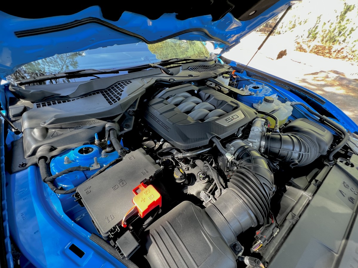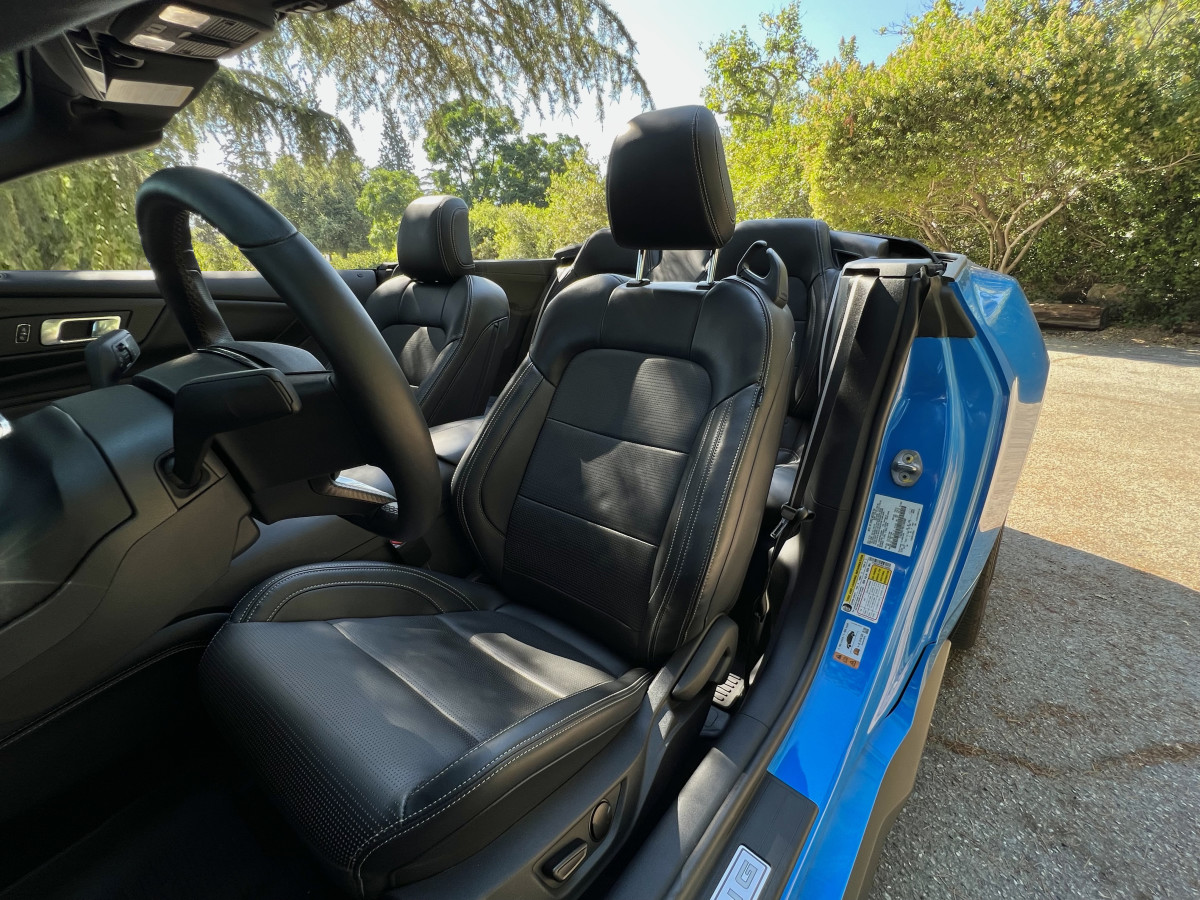 Standard safety features for all Mustangs include frontal collision warning with automatic emergency braking, lane-keep assist, a blind-spot monitor with rear cross-traffic alert, rear parking sensors, rain-sensing wipers, and automatic high beams. Adaptive cruise control and a safe passenger exit warning are available as options. All of these features function as they should, with no false alarms or glitches to report.