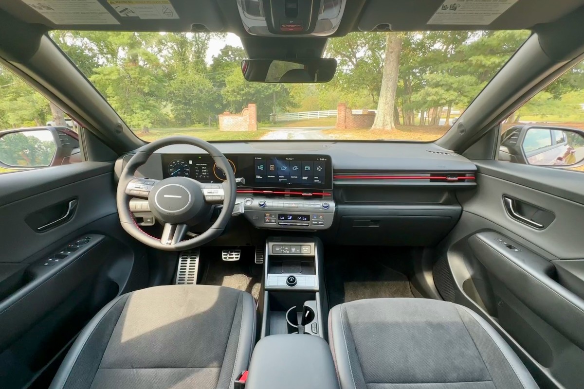 Because we joined Hyundai for the Kona first drive launch, we drove the U.S. equivalent of the Kona N Line with the Ultimate package from Baltimore out to the rolling Maryland countryside on a hot August day, and we returned to the city in the Hyundai Kona N Line without the Ultimate package. (We have not yet driven the naturally aspirated 2024 Kona.) We found pickup to be a tad slow even with the turbo, but we appreciated the intuitive steering and nimble handling on the narrow city streets.