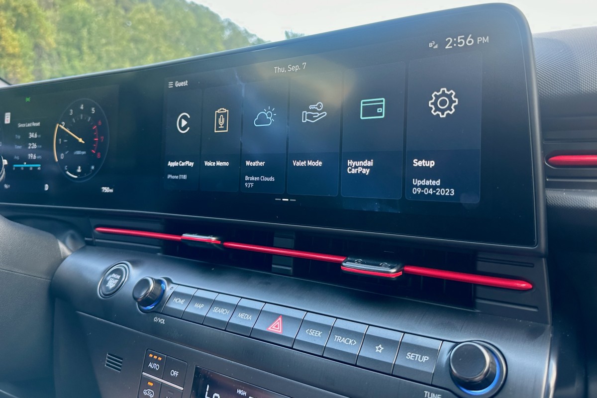 The Kona gets several notable technological value-adds for 2024. A 12.3-inch touchscreen infotainment display is now standard across the lineup, where the 2023 Kona had a standard 8-inch display that was replaced with a 10.25-inch screen for higher trims. Wireless Apple CarPlay and Android Auto are now integrated on all trims in Canada except the N Line with the Ultimate package, which requires wired connections. If you think it’s counterintuitive to get less feature for more money, you’re correct: the wireless versions of these apps are not compatible with Hyundai’s on-board navigation system, which is included in the Ultimate package. Hyundai promises an over-the-air (OTA) update coming soon that will add wireless connectivity to this version of the infotainment system as well.