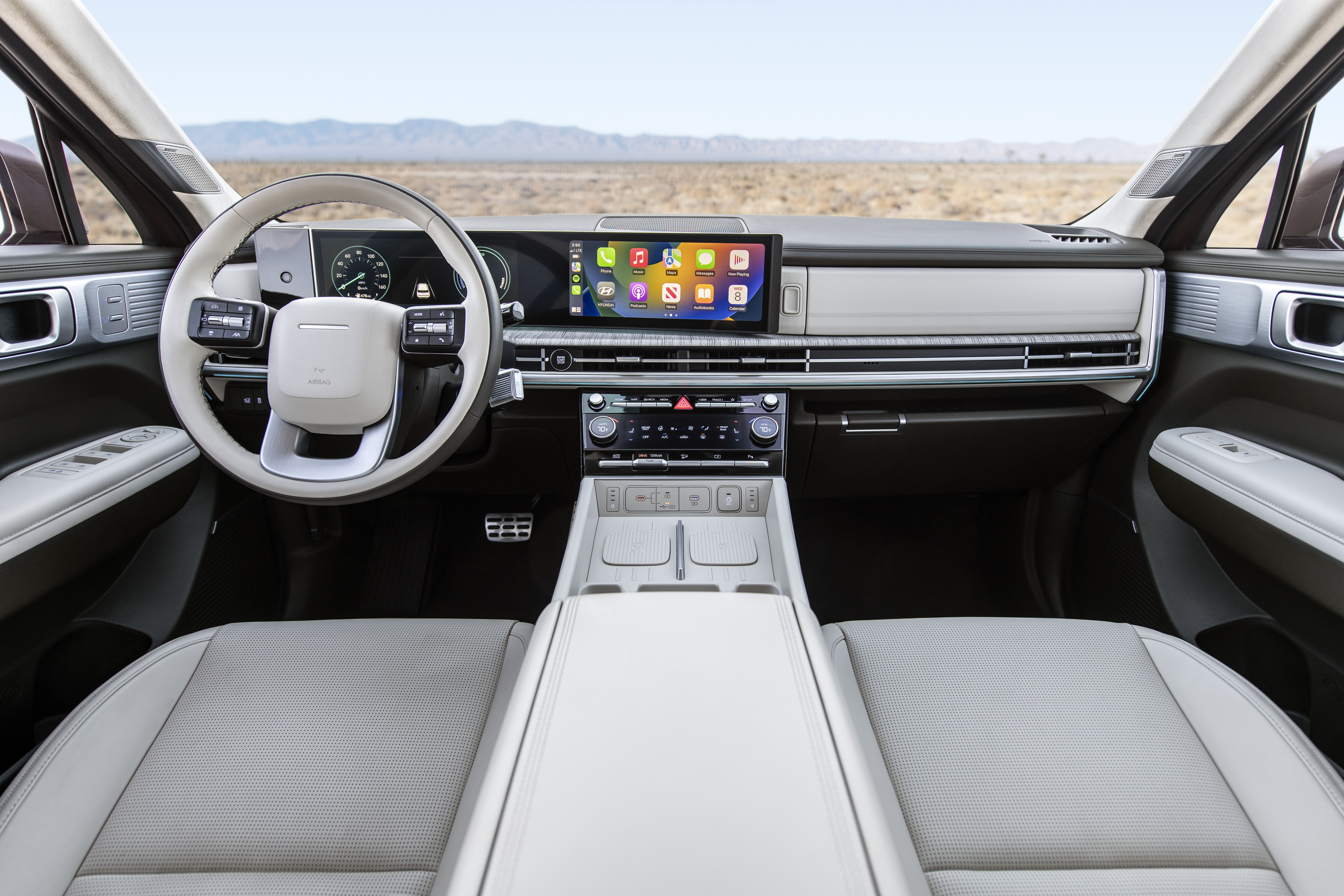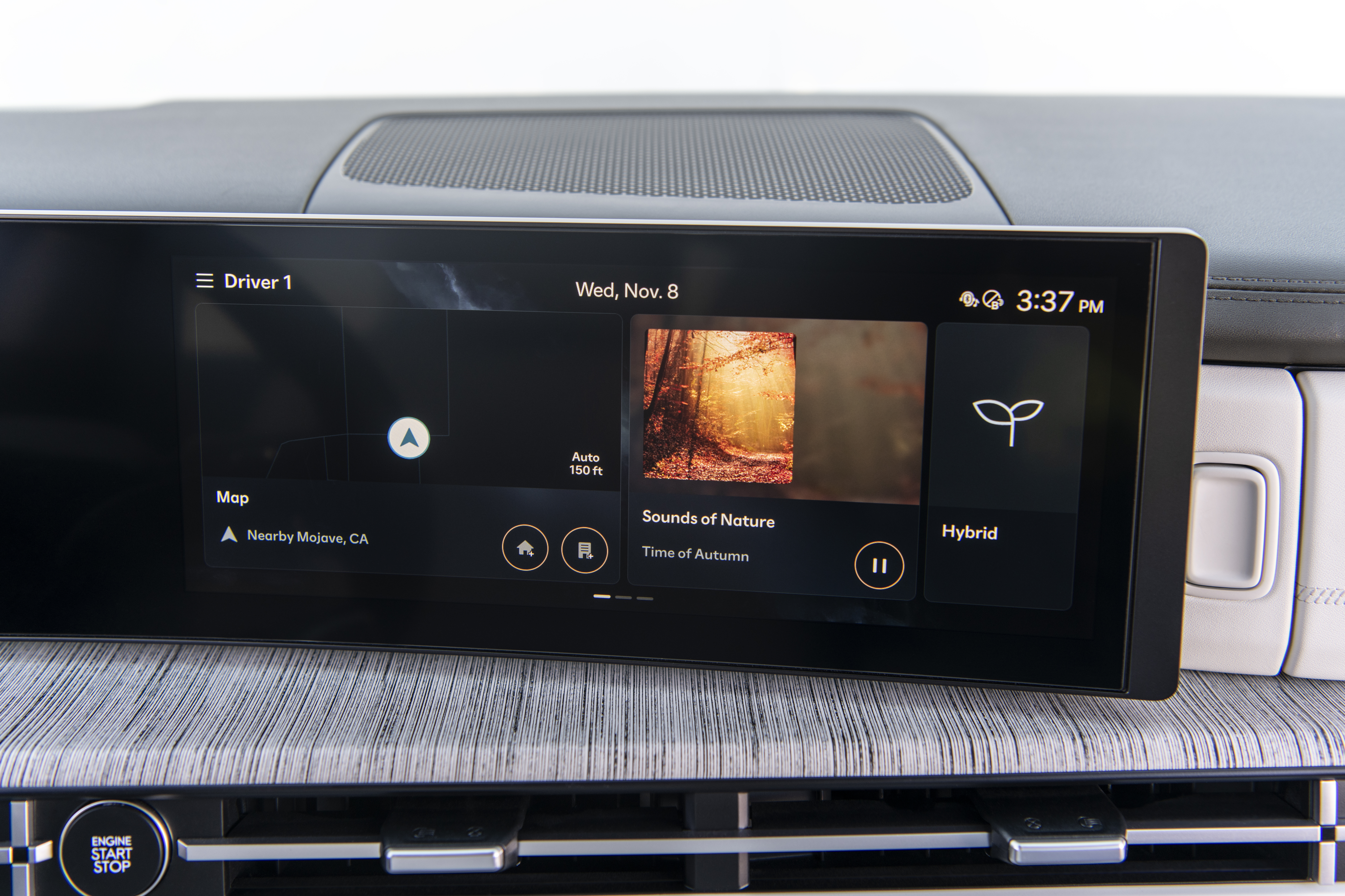 In our experience, the touchscreen display was another one of the Santa Fe’s delights, with easy access to controls, intuitive menus, and super-crisp graphics and camera views. Pairing a phone to wireless Apple CarPlay took seconds, and it comes standard across the lineup along with wireless Android Auto. This system includes a 12-speaker Bose stereo, dynamic voice recognition, and a total of six USB ports.
