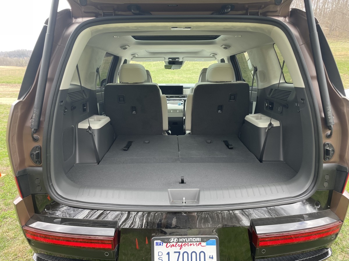 The cargo area offers 413 litres of cargo space, which expands to 1,148 and 2,267 litres with the third and second rows folded, respectively. The optional roof rails can support 100 kilograms (220 pounds), and Hyundai integrated a new grab handle that sits flush in the pillar just behind the rear door and extends to provide support when loading cargo.