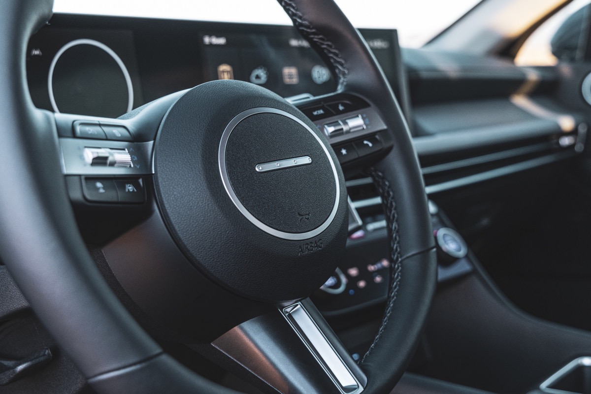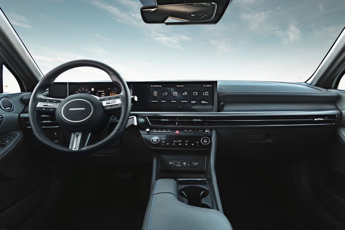 The Sonata’s seats do not appear to have changed from 2023, but the dash has. The vents now flow all the way across, and the padded portion of the centre console now extends far enough forward that it is separated into two pieces when the lid is open. The gear shifter has been moved to the steering column, and, perhaps most salient, the steering wheel is redesigned. It’s now a T-shape with a slender rim and the italicized “H” logo replaced by a bar with four dots spelling out “H” in Morse code. In Canada, the Preferred-Trend trim comes with a basic black interior with leather upholstery. The N Line trim comes with a light grey option with Nappa leather, suede inserts, and red accents.