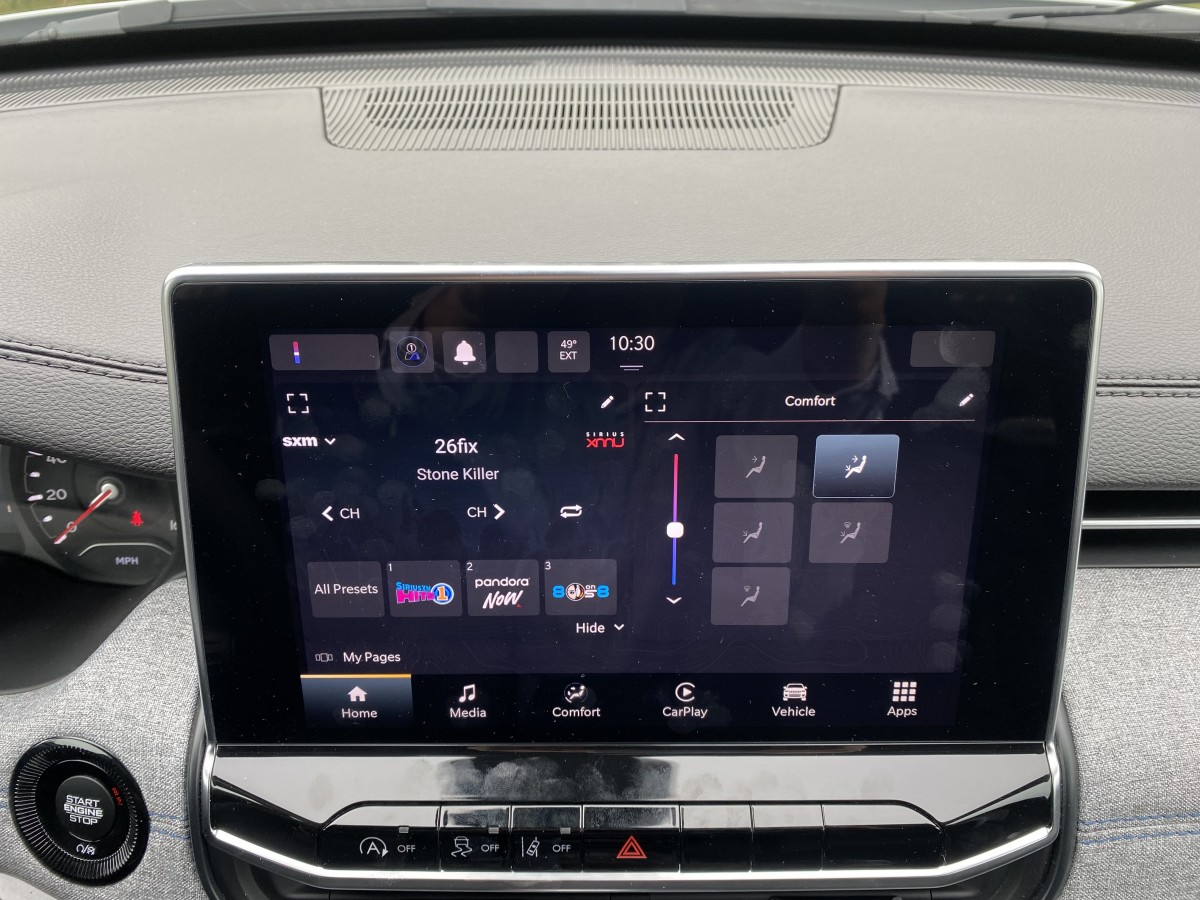 A 10.1-inch touchscreen with Uconnect 5 software comes standard, unlike other SUVs that pair smaller screens in a larger housing meant to accommodate both sizes. It's slick, crisp, and generally quick. Also, unlike similar screens in more expensive models like the Jeep Grand Cherokee, the Compass has no legibility issues with the row of text and icons at the top of the display. Everything is always clear and menus are simple to browse and adjust vehicle settings. The only demerit is the home screen, which does not allow direct app switching for climate, radio, or anything else (you must tap a tiny square icon in each corner of the tile). That said, wireless Apple CarPlay and Android Auto, and USB-C ports come standard. Factory navigation is optional, but it's built-in so you can pay to upgrade it later. A wireless charging pad is optional on higher trims and secures phones from shifting around.