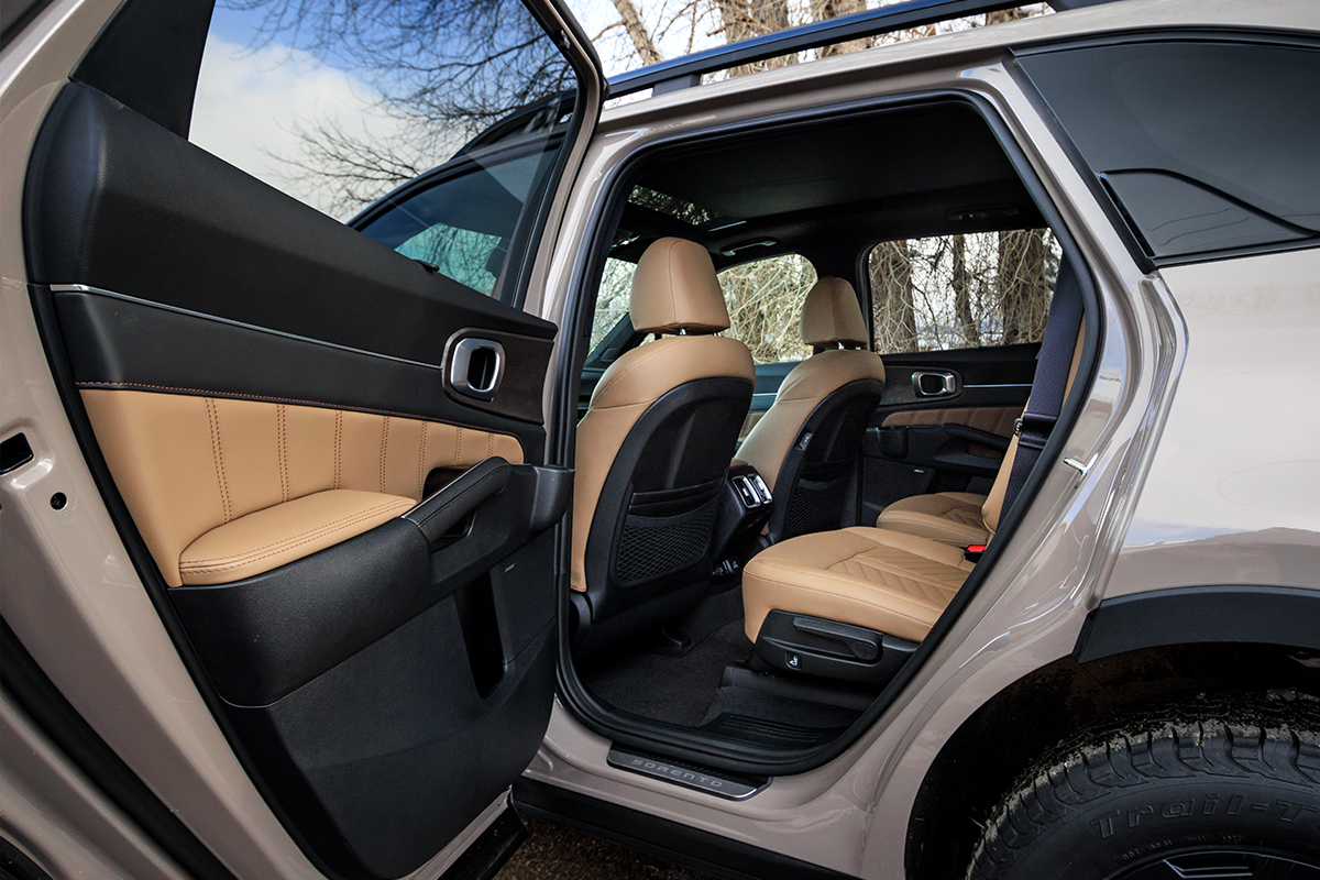 The Sorento’s trims in Canada are LX, EX, the rugged-looking X-Line, X-Line Limited, and the new X-Pro. The new trim looks much like the X-Line but with smaller wheels and all-terrain tires. Both the X-Line and X-Pro get even more aggressive looks than the other Sorentos, with blacked-out wheels and earth-tone paint colours. They’re visually cleaner than Subaru’s Outback Wilderness but just as outdoorsy.