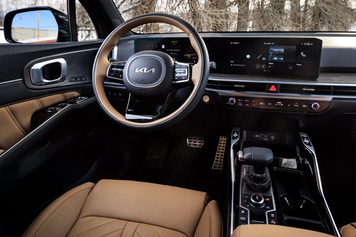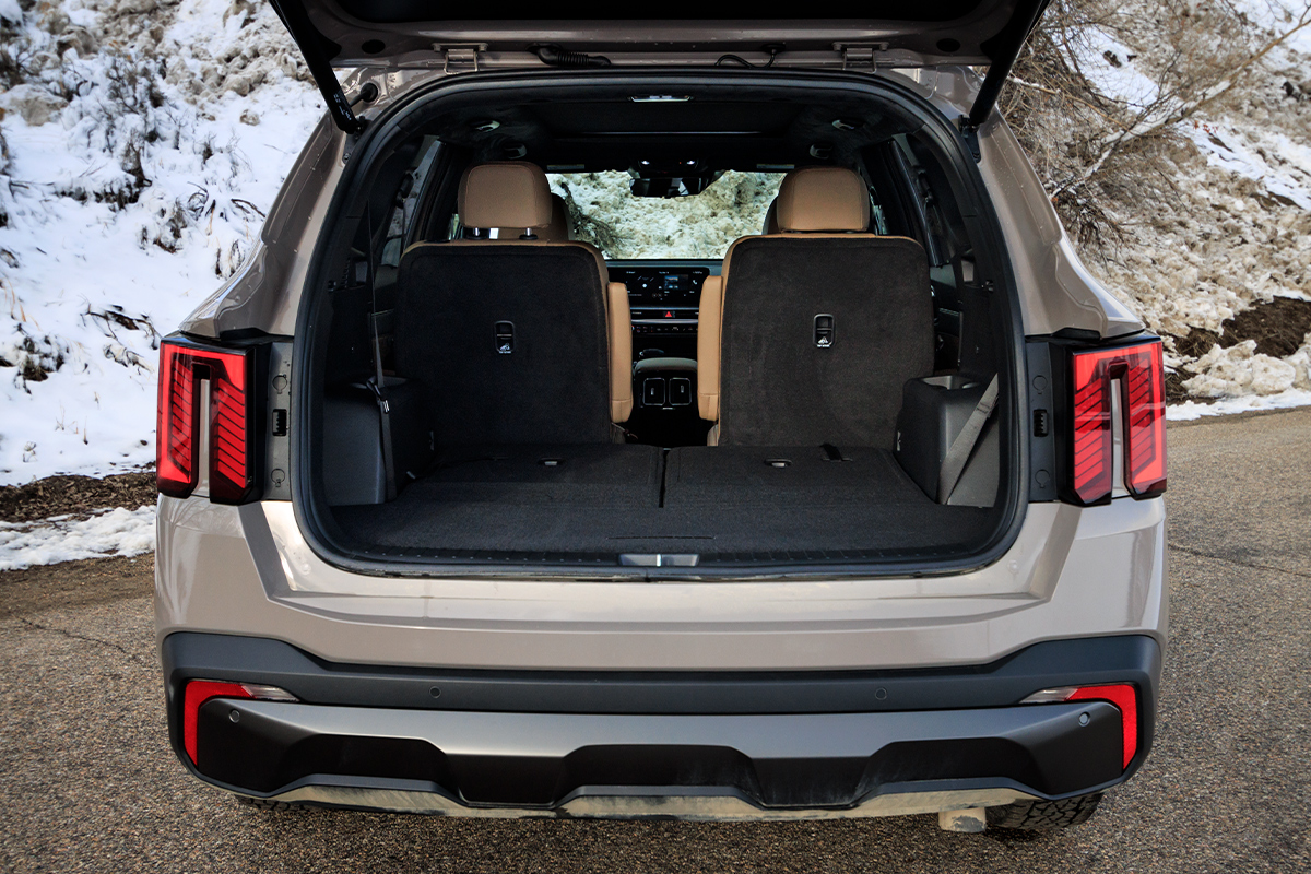With the optional captain’s chairs in the second row, it’s also possible to keep a close eye on what’s happening back there, and even climb into the back without opening the doors, which we tried on our test drive. The Sorento’s new dash does not have any convenient areas to stash a purse like the EV9, but its controls and layout are logically ergonomic. There’s nothing too far out of reach, and there’s plenty of conventional small-item storage space.