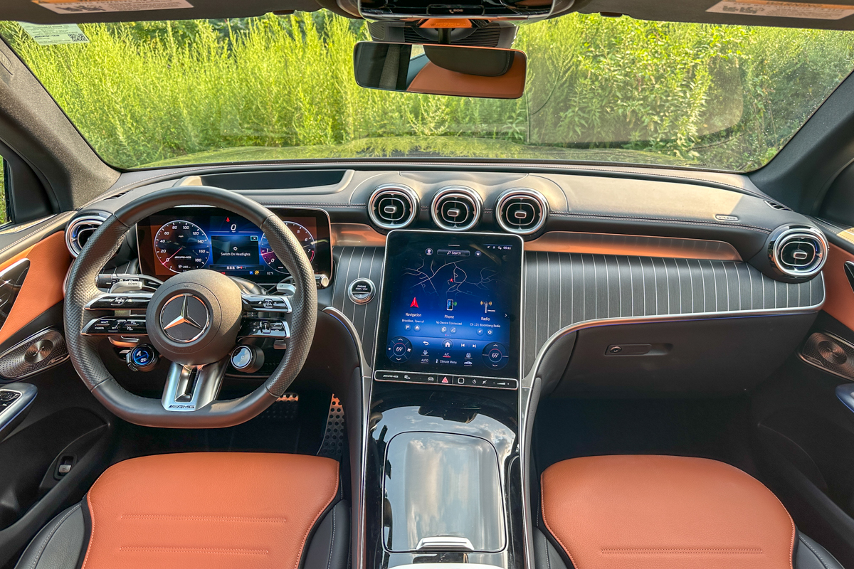 The GLC’s interior is certainly sumptuous at first glance. There’s far too much going on to take away any impression of scarcity or austerity. Our Mercedes-AMG GLC 43 SUV test car was outfitted with two-tone Sienna Brown and Black leather upholstery, an extra-cost upgrade over the Artico synthetic leather that’s standard even at the AMG level. It also featured the optional wood-and-metal dash treatment, which echoed the grille’s pinstripe effect. And then there were all the screens, buttons, ambient lighting, and vents. Even at this relatively low end of the brand’s pricing spectrum, the GLC is heavy on gadgetry, just as we’ve come to expect from Mercedes. This crossover’s interior is absolutely class-leading if you’re into that sort of thing.