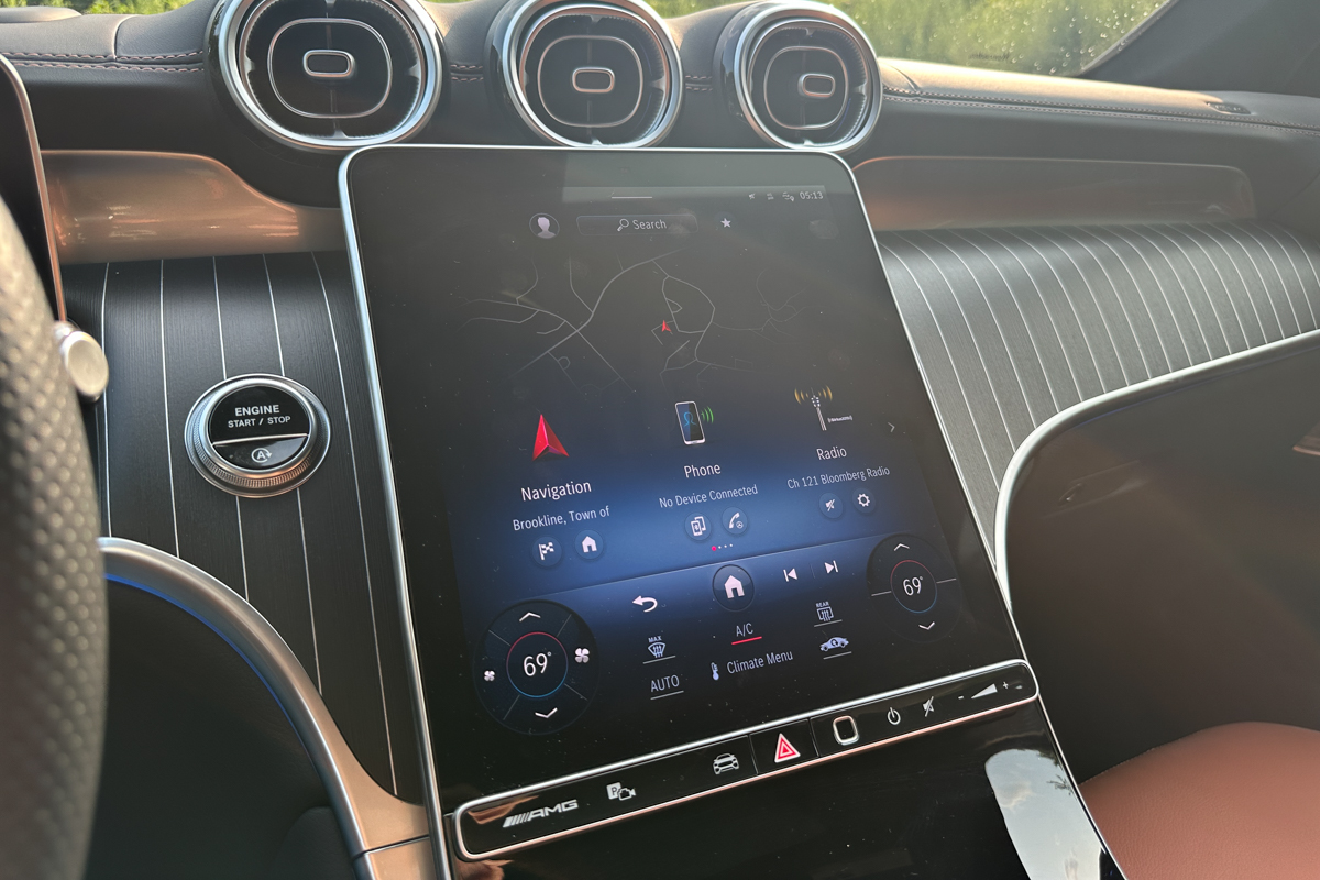 The central focus of the GLC’s cockpit is the portrait-oriented, tablet-style touchscreen. Mercedes declined to make it appear flush with the dash or to integrate it into a single display shared with the digital gauge cluster, and we respect the decision.