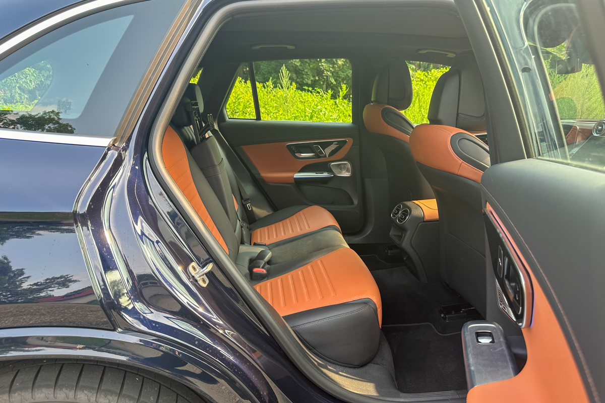 The layout of the GLC’s cabin is distinctly driver-biased, with the centre touchscreen, climate controls, and even the central bank of HVAC vents all angled toward that left front seat. The classic Mercedes door-mounted seat adjusters contribute to a sense that there are buttons everywhere, which is particularly prevalent in AMG models. There, the steering wheel gets an extra horizontal spoke, providing further real estate for additional controls. Both front seats offer heat and memory functions as standard. Front-seat ventilation and heated rear seats are available.