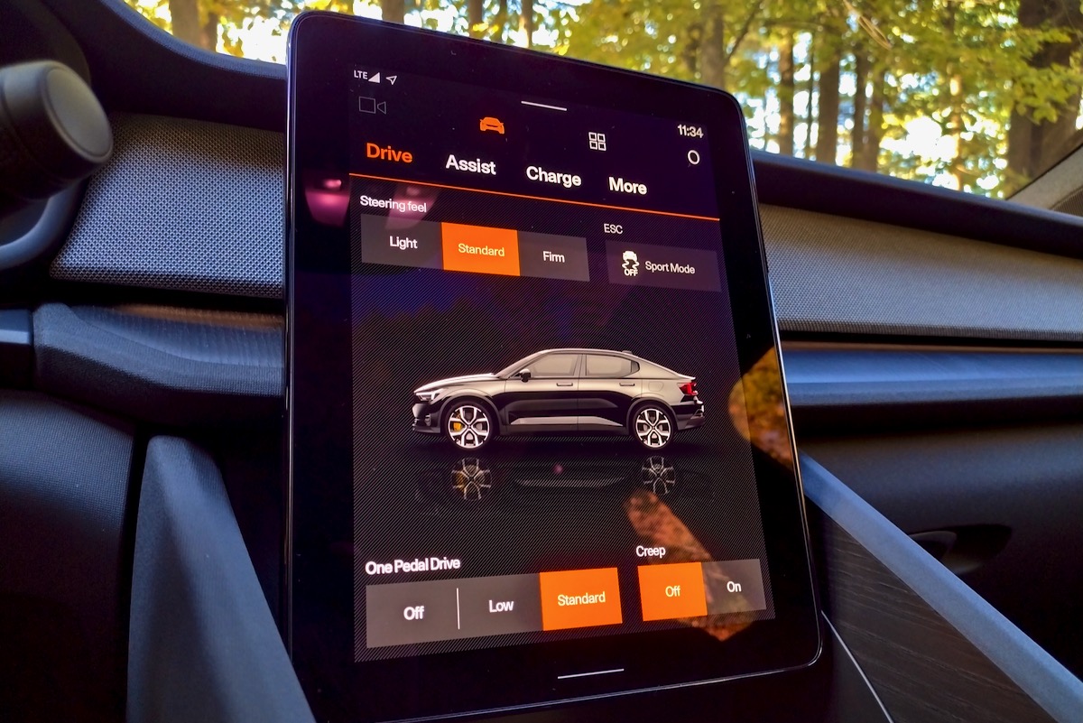 Polestar includes multiple settings for regenerative braking, ranging from no regeneration to a fully one-pedal-driving mode. Adjusting the level of regen requires going into a touchscreen menu, where you’ll also find drive modes and a setting for steering weight. That’s a bit annoying, but at least one-pedal mode lives up to its name. It requires only minimal use of the brake pedal in normal driving, and can even bring the car to a full stop in some circumstances.