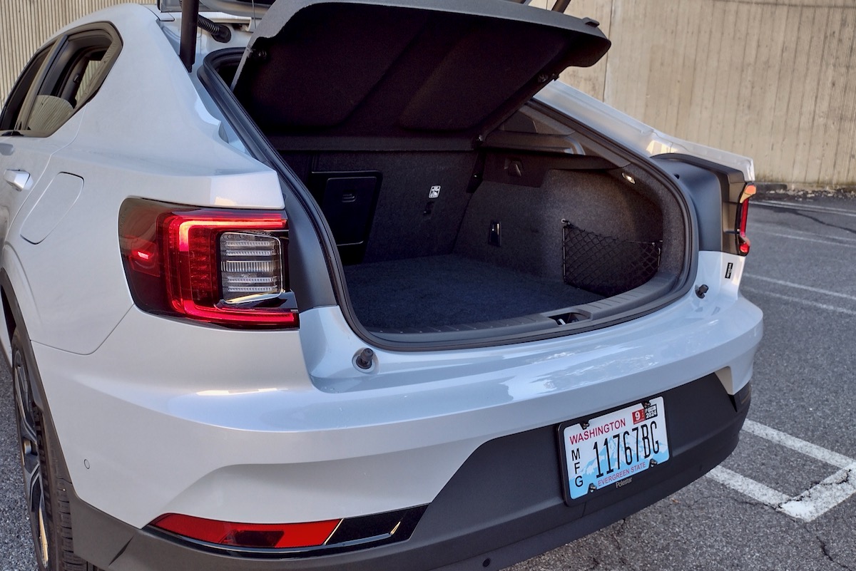 The Polestar 2 is effectively a high-end compact car. Its rear hatch helps make the most of the 2’s small footprint, however, affording 407 litres of cargo space with the rear seats up and 1,097 litres with the second-row seats folded. That gives the Polestar more cargo space than a Hyundai Ioniq 6, and the rear hatch creates a wide aperture that makes loading and unloading cargo easier as well.