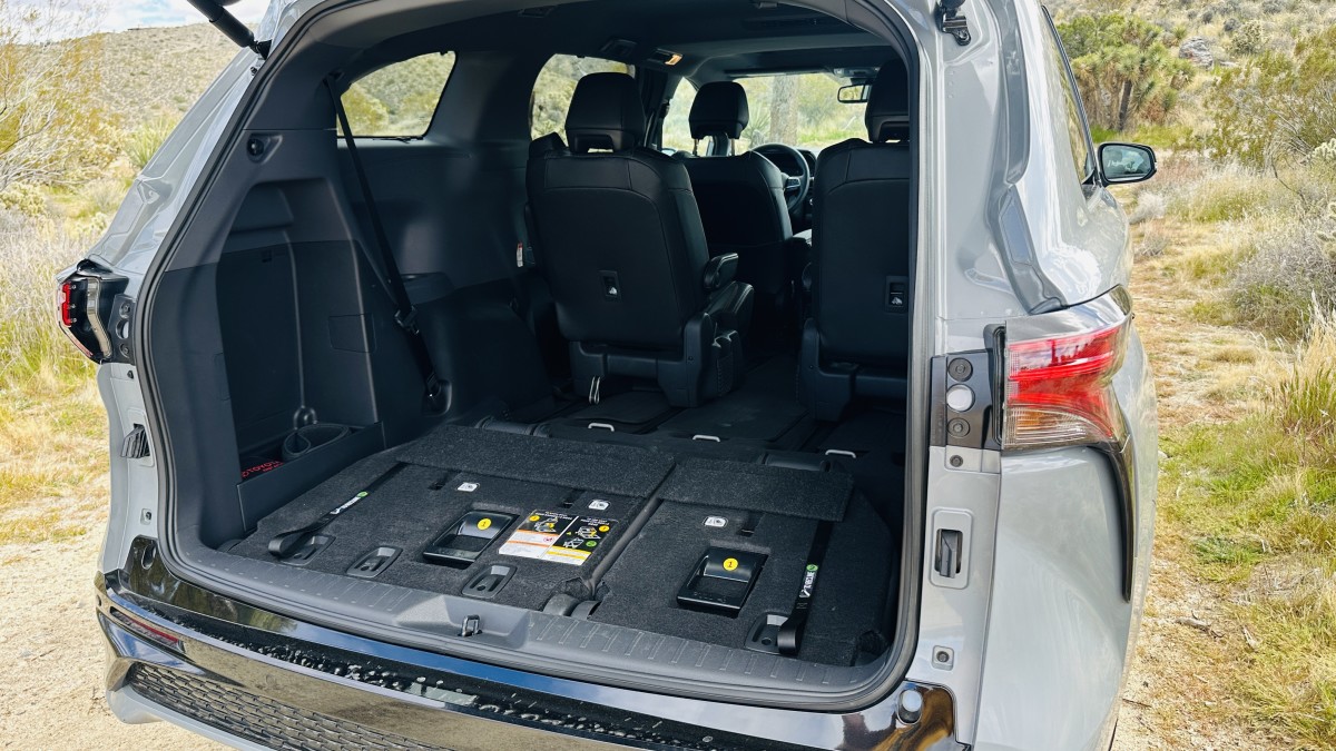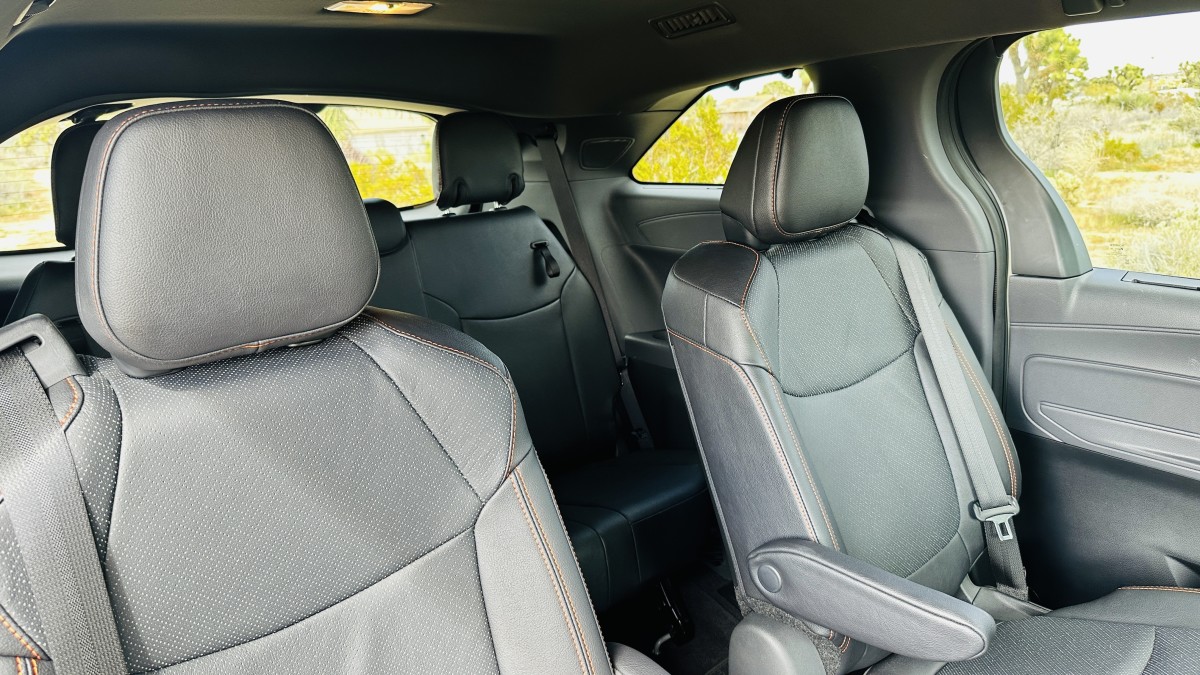 There are plenty of USB ports, both -A and -C, scattered about the cabin, and our tester comes with a 1500-watt inverter with a 120-volt outlet for the second row and one in the rear cargo area. Be warned that you must turn on these outlets using a button located near the driver’s seat. Neglect to push it and your laptop will just sit there wasting precious charging minutes.