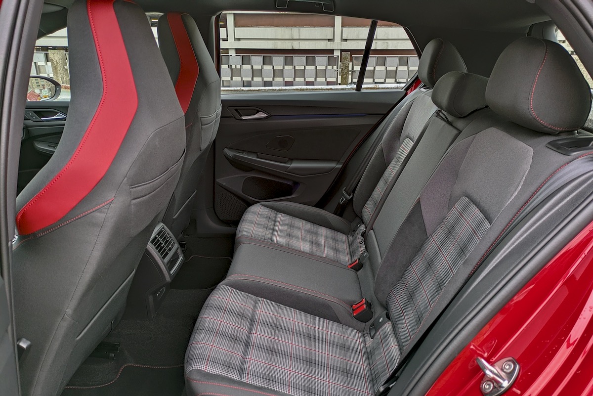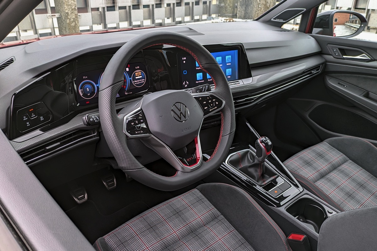 The interior blends classic GTI styling touches with the obligatory modern tech features. A digital instrument cluster and large infotainment screen mingle with heavily bolstered (yet well-cushioned) front seats with the GTI’s signature plaid upholstery. The chunky shifter also has golf-ball-like dimples that show an admirable sense of humour, but the steering wheel looks it came straight out of a VW Atlas.