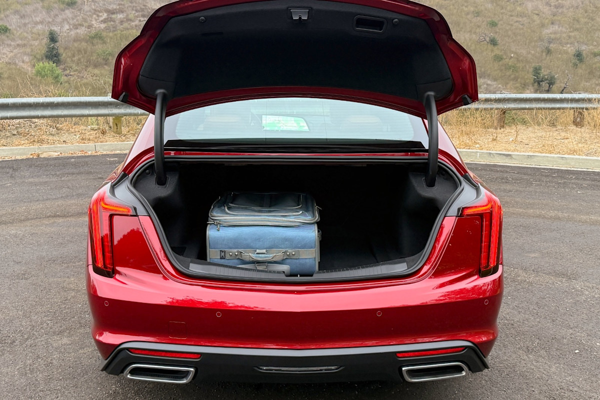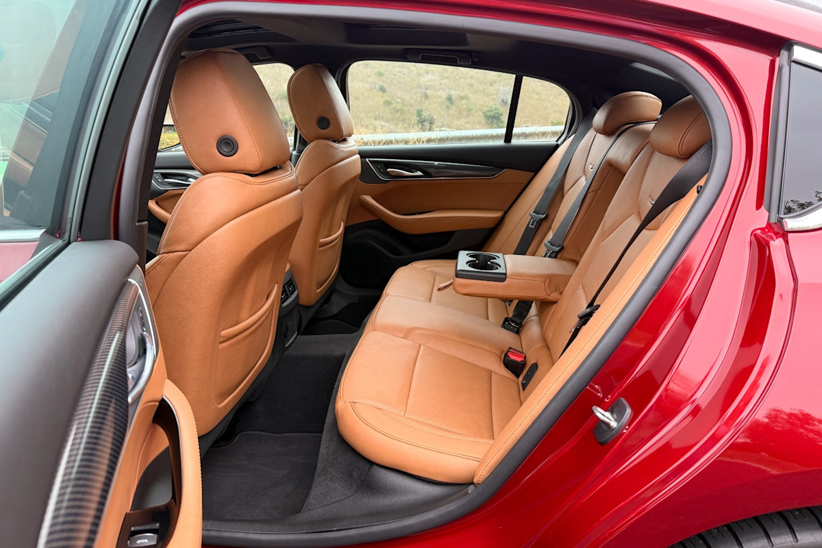 Rear-seat passengers enter and exit through a wide door opening, but taller people must duck under the fast roofline. Headroom is also in short supply, but the CT5’s back seat offers good legroom and thigh support. As with German vehicles, occupants sit inboard, making it almost impossible to squeeze in a fifth person.