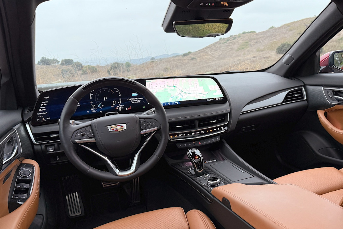 You can’t miss the new 33-inch display that dominates the 2025 CT5’s interior. In addition, the strip of climate control icons beneath it adopts a more upscale look, but Cadillac wisely retains the switchgear, which offers access to features and functions without the need to fumble around with the touchscreen.