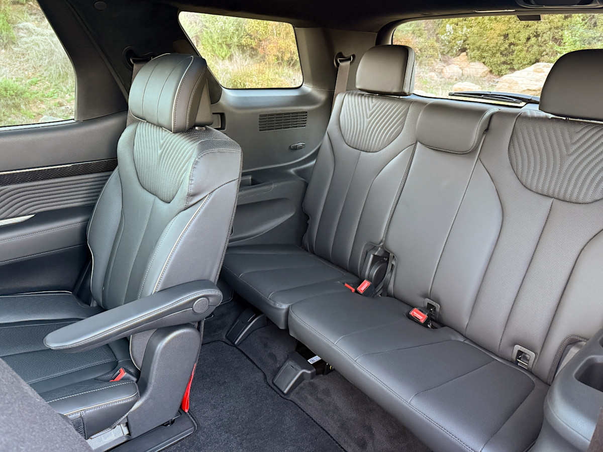 Hyundai equips the Palisade with three rows of seats usable by adults. Our test vehicle featured a seven-passenger arrangement with second-row captain’s chairs, but eight-passenger seating is standard with the base Preferred trim and available on the Urban trim.