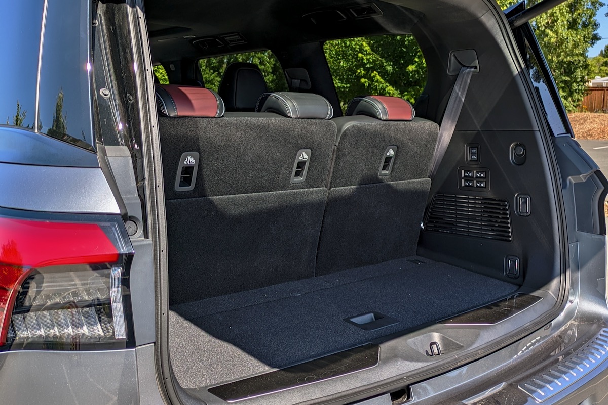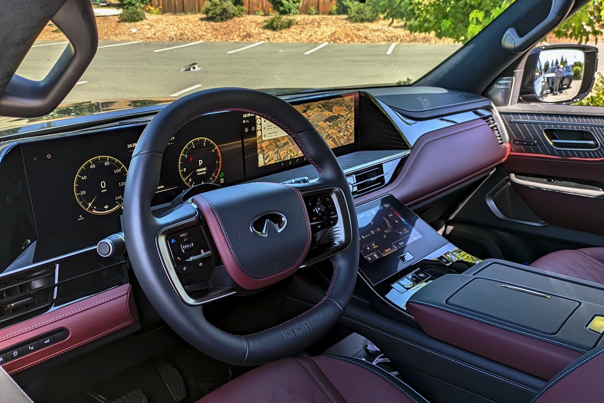 Infiniti makes reconfiguring the interior for passenger or cargo hauling easy with a power liftgate and power-folding second- and third-row seats. Controls in the cargo area, on the infotainment touchscreens, and on the seats themselves are handy, although we did find that second-row seats didn’t always have room to move if the driver’s seat was set up for taller occupants. Infiniti offers a 40/20/40 split-folding second-row bench seat or reclining captain’s chairs on the Autograph grade, with a reclining 60/40 split-folding third-row bench.